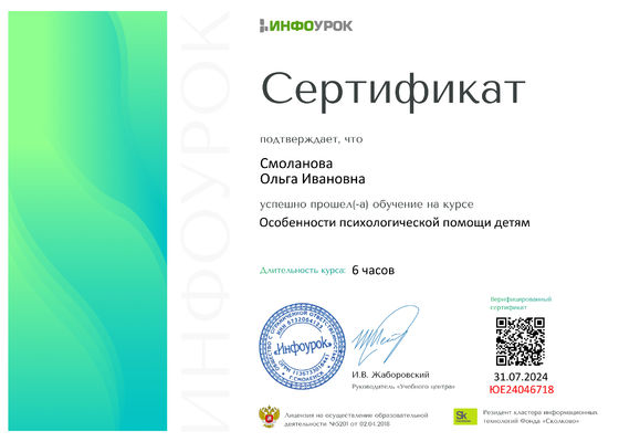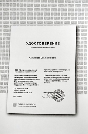 - "Профилактика гриппа и острых респираторных вирусных инфекций, в том числе новой короновирусной инфекции (COVD-19)". ООО "Центр инновационного образования и воспитания" 2021 ГОД