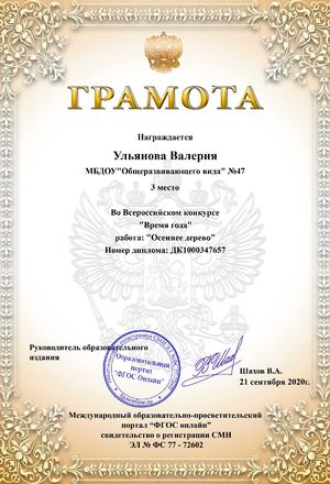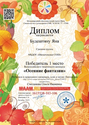 Аттестация: 21.10. 2019 г по решению аттестационной комиссии присвоена первая квалификационная категория.