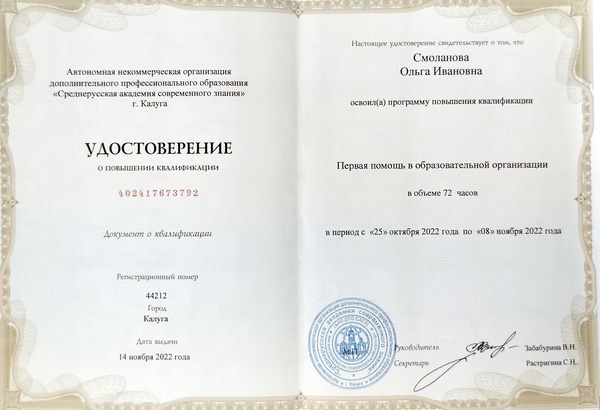 - "Первая помощь в образовательной организации". Автономная некоммерческая организация дополнительного профессионального образования "Среднерусская академия современного знания" . 2022 год